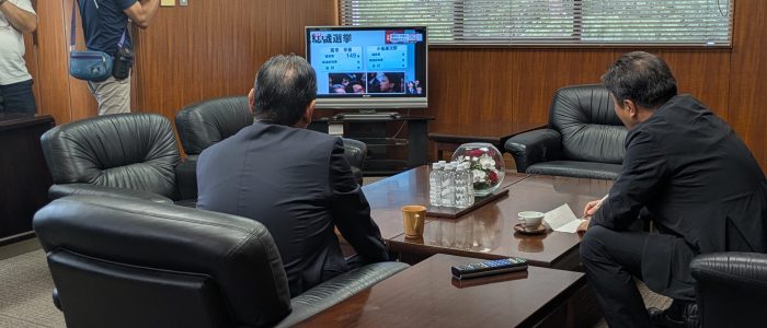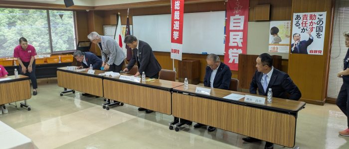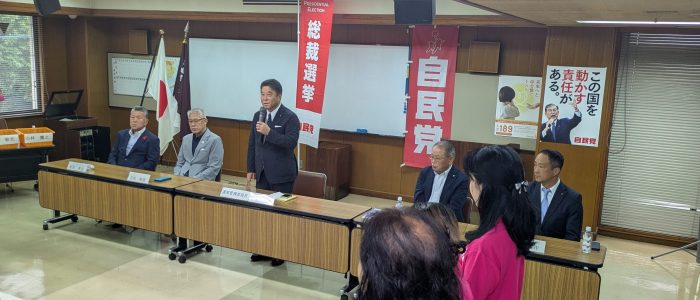 15時過ぎより前川県連会長、松田幹事長による記者会見が行われ、高市氏が党員票で全国1位を獲得したことを評価し、これは党員の民意が反映された民主的な結果であると述べました。また、史上初の女性総理誕生に期待を示し、高市氏の「全世代総力戦」の言葉通り、国民のために尽力することを期待する考えを表明しました。また、石破前総裁にねぎらいの言葉を述べた。